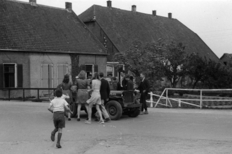 Foto: Een Canadese jeep bereikt Barendrecht in de vroege middag van 8 mei 1945.