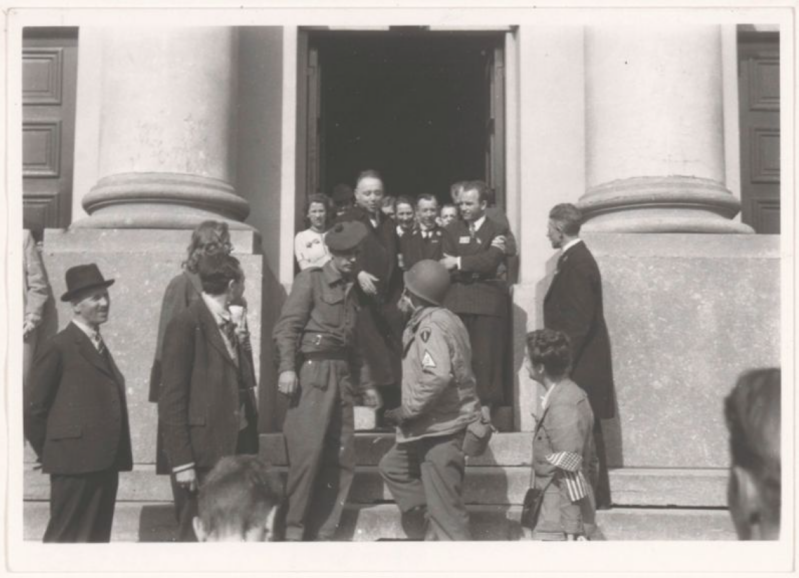 foto van de bevrijders voor het gemeentehuis.