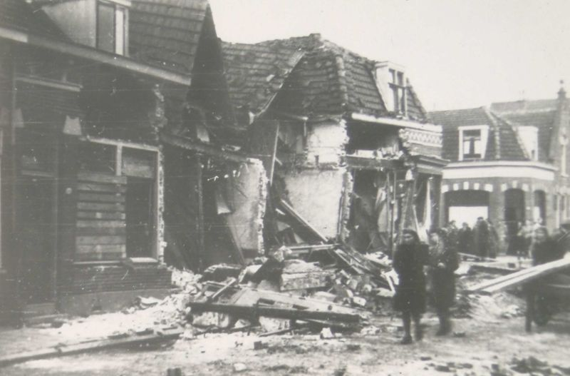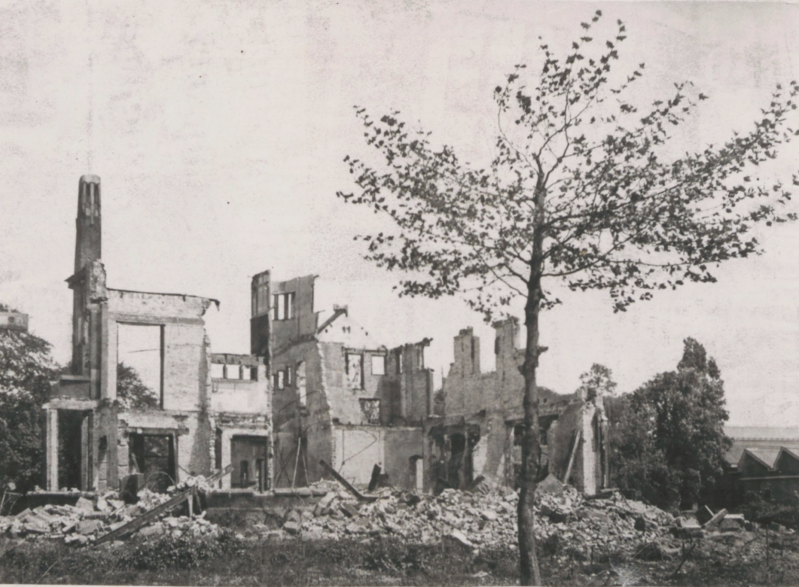 De ruïne van villa Simpang aan de Stationsweg na het bombardement. In deze villa was de Duitse Ortskammandanttur gevestigd.