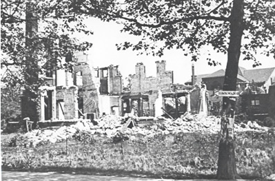 De ruïne van villa Simpang aan de Stationsweg na het bombardement. In deze villa was de Duitse Ortskammandanttur gevestigd.