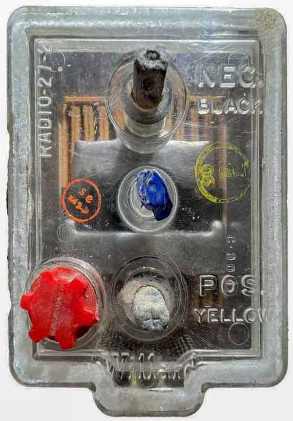 Hier gaat het om. Wanneer deze pen ingedrukt wordt met de sleutel (rechts) , dan kan de interne 2 Volt accu geladen worden