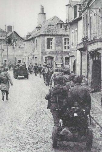 'Carentan' Een paar dagen na D-Day in Normandië trekken GI's een Utility Cart door de Rue Holgate in Carentan, Frankrijk.