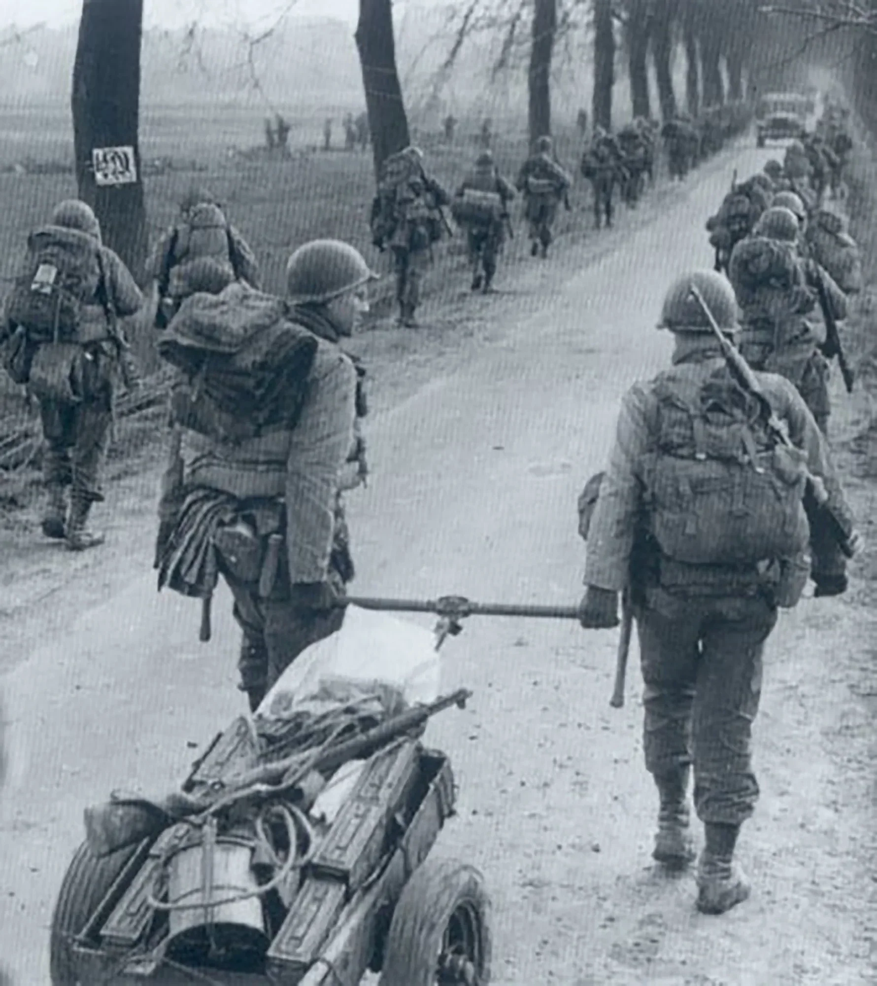 Parachutisten van het 1st Battalion/504th Regiment van de 82nd Airborne Division gebruiken een kar om voorraden te vervoeren in de Belgische Ardennen tijdens het Ardennenoffensief in december 1944.