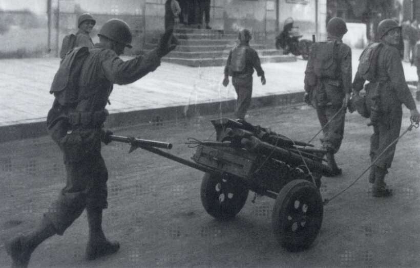 Infanteristen van de 327th Glider Infantry van de 101st Airborne Division worden verwelkomd door een Nederlands meisje bij het verlaten van de Market Garden Landing Zones in september 1944. Hoewel het niet duidelijk is, kan de kar een M4A1 machinegeweerwagen zijn, uitgerust met een M1917A1 machinegeweer op zijn statief. De 'buis' boven het rechterwiel van de kar is hoogstwaarschijnlijk een van de steunpoten van het statief. De watergekoelde Browning MG en zijn statief werden met speciale beugels aan de kist van de kar bevestigd.