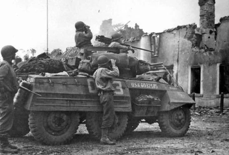 US Army M8 Greyhounds leading an Allied column into their town as French civilians celebrate the arrival in their town by sharing a bottle of wine with the soldiers.